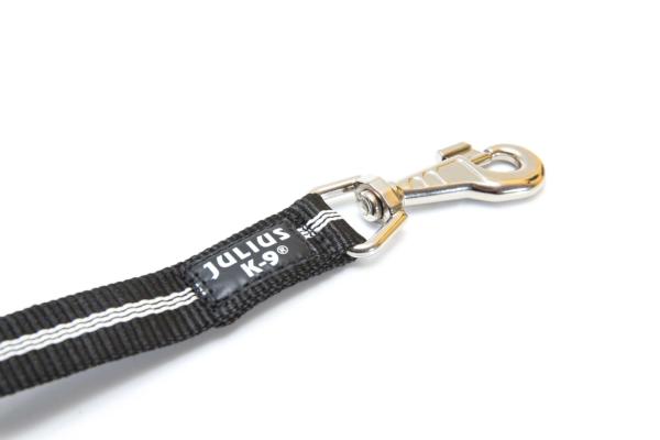Guinzaglio in nylon nero con cuciture centrali in materiale FLUORESCENTE. Moschettone in acciaio inossidabile. SENZA MANIGLIA.