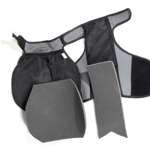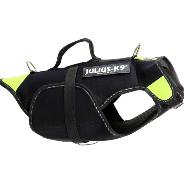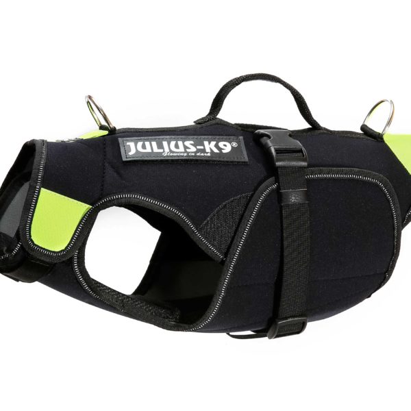 Giubbino completamente in neoprene con imbottitura galleggiante removibile, dotato di regolazioni in velcro e con cinghia sottopancia.